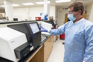 WSLH Microbiologist Tim Davis interacts with a MiSeq instrument during COVID-19 genomic sequencing. (Photo by Bryce Richter / UW-Madison)